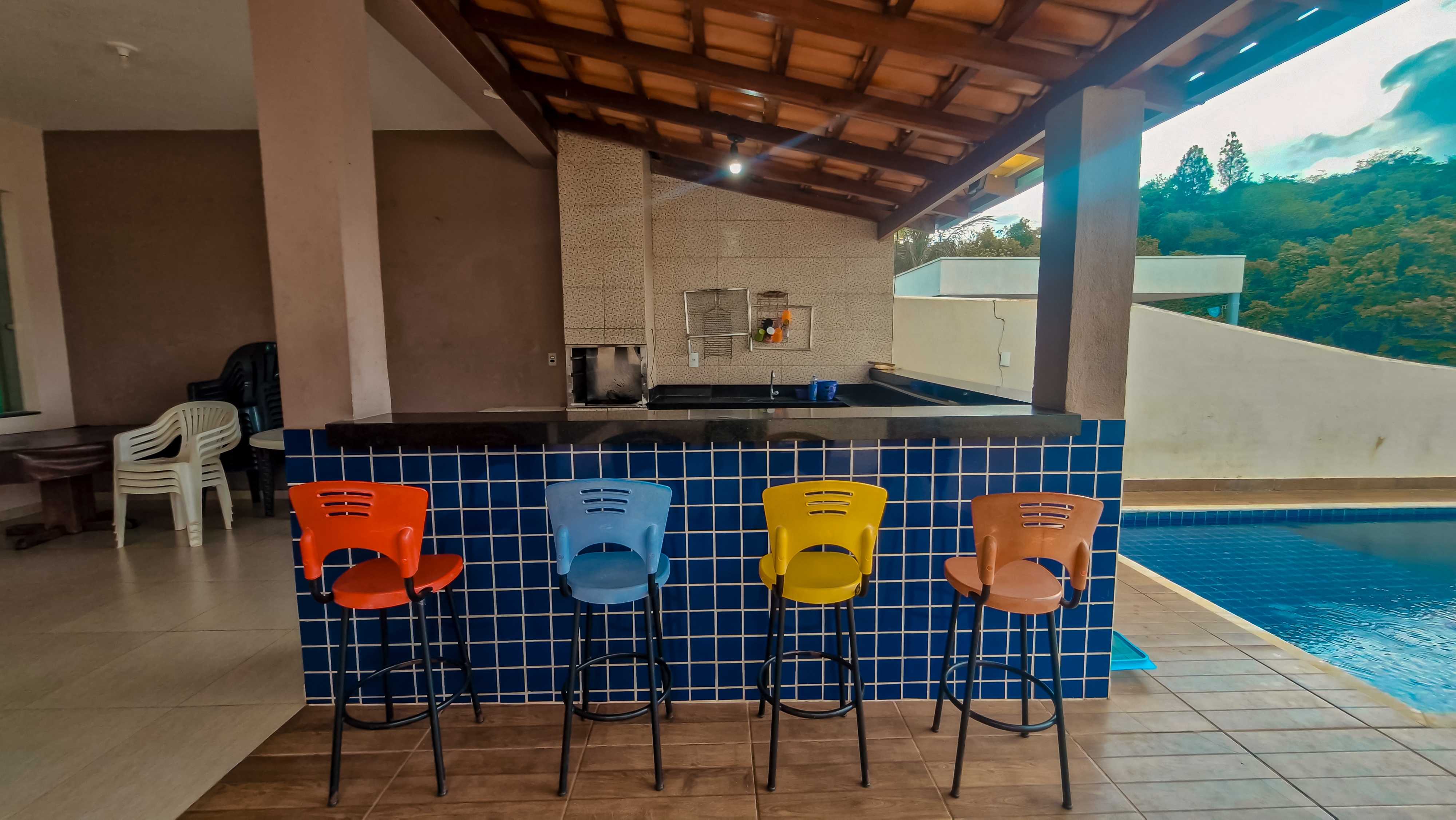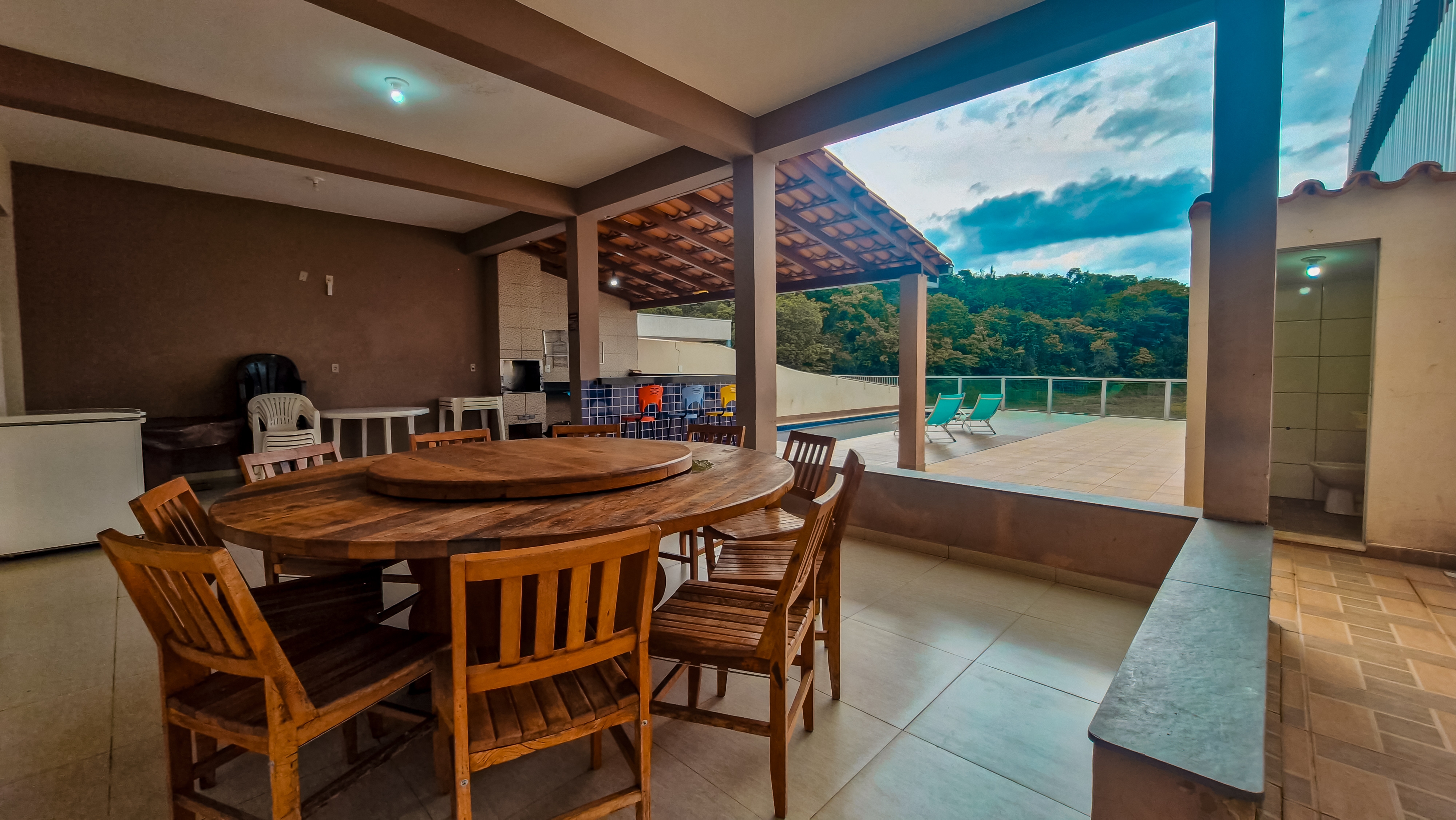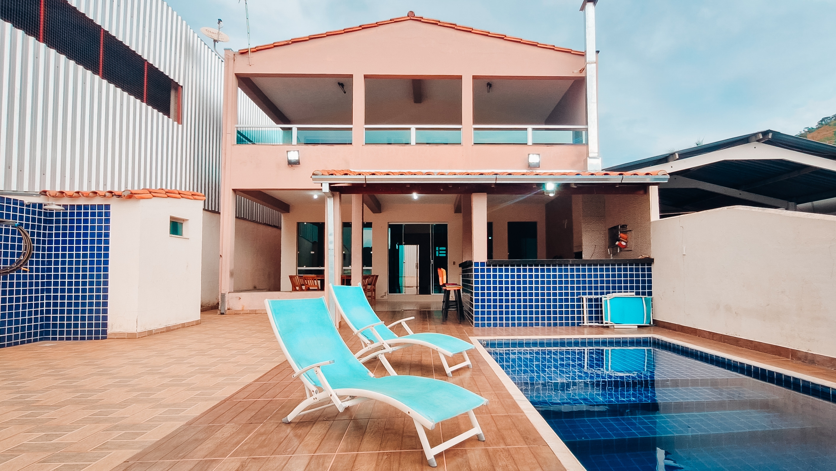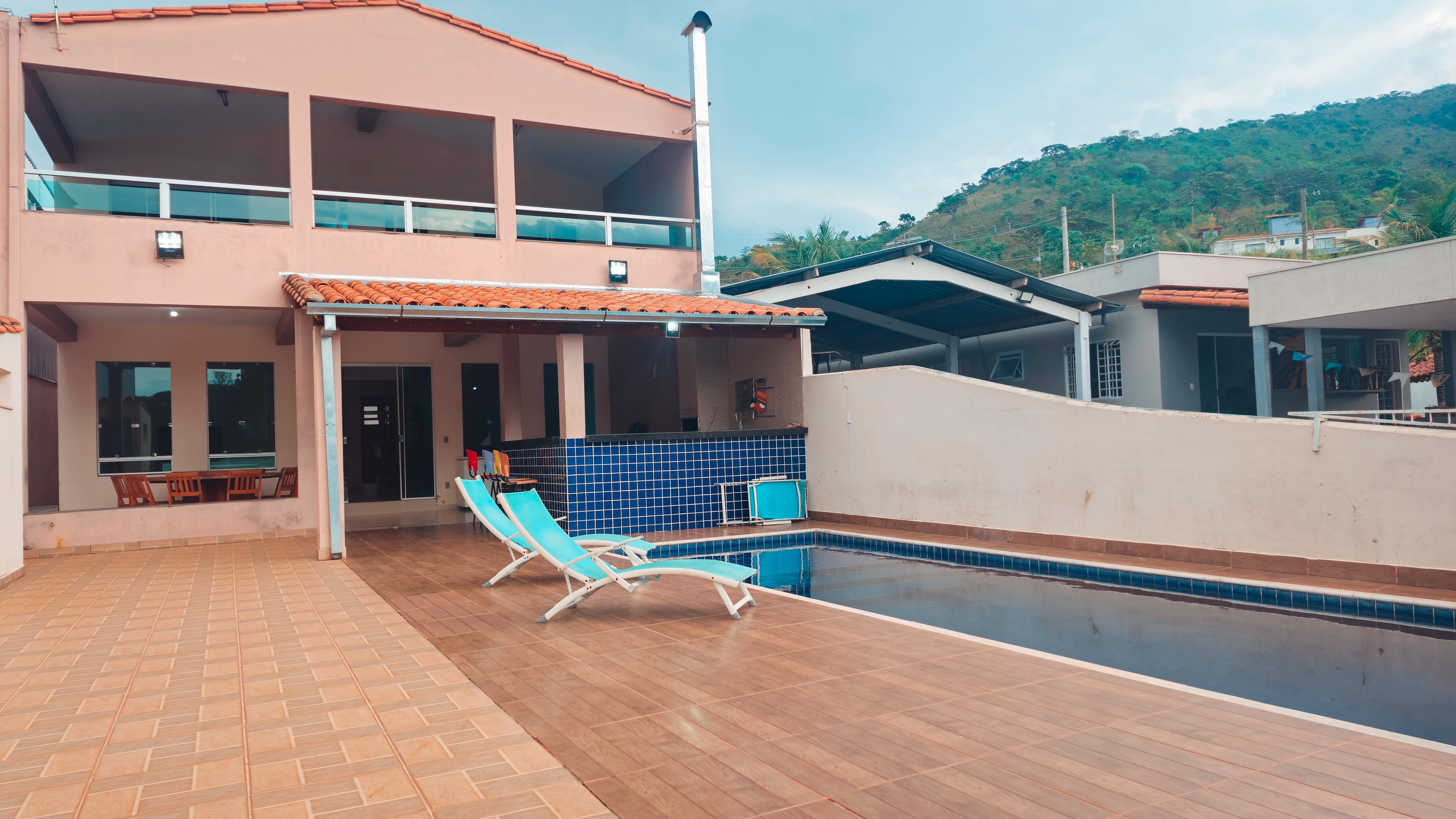 Para garantir momentos de descontração e lazer, temos um espaço gourmet com churrasqueira de alvenaria, lavabo, uma ducha refrescante e uma piscina convidativa. Na parte de cima, mais 4 suítes, todas com cama de casal e de solteiro, proporcionando o conforto necessário para uma estadia revigorante.